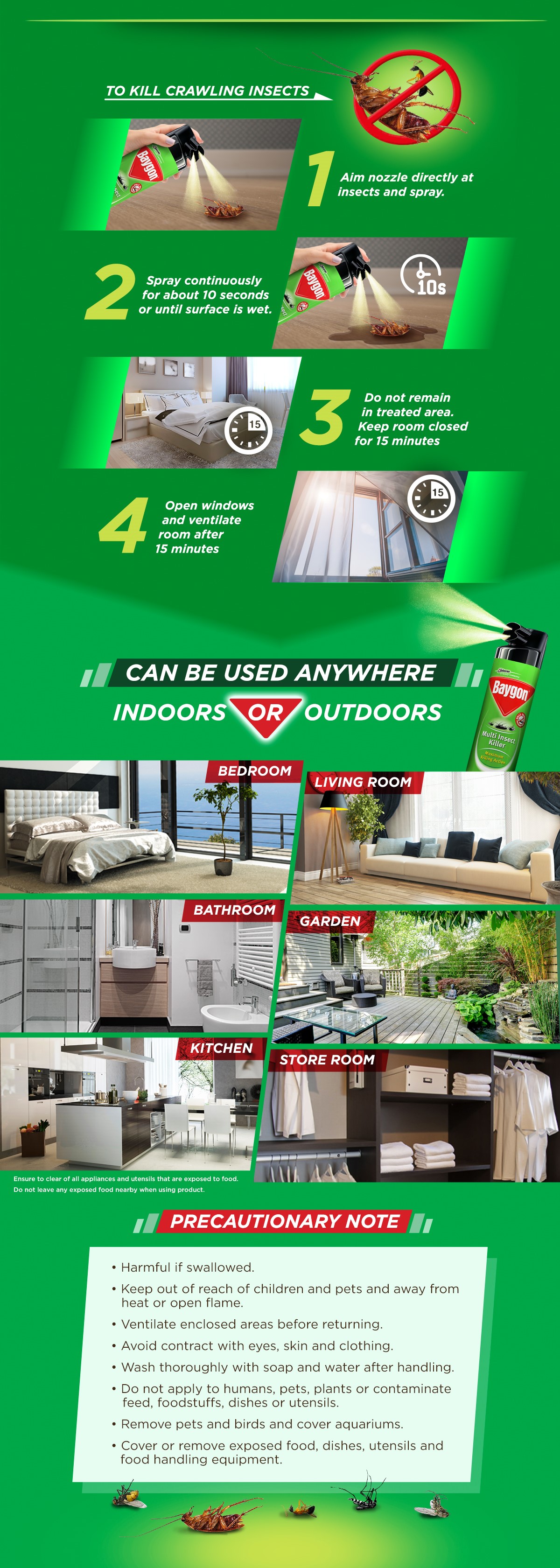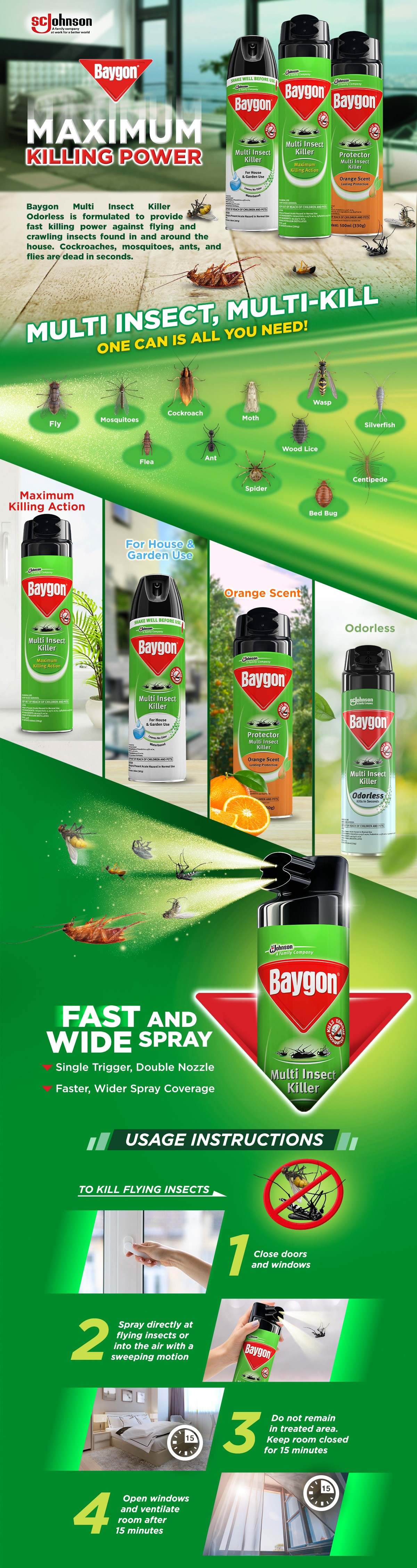 Baygon Mosquito Multi-Insect Killer Water-Based Spray Aerosol is a powerful formula is specially designed to kill crawling, flying and garden insects. Cockroaches, mosquitoes, ants and flies are dead in seconds.