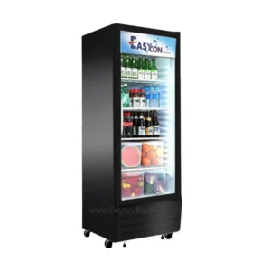 The Easycon 420L Black Glass Door Beverage Chiller is a sleek and efficient refrigeration unit designed for commercial use in restaurants, cafés, bars, convenience stores, and retail environments. With a capacity of 420 liters, this chiller provides ample space to keep beverages, dairy products, and chilled food items at the perfect temperature while displaying them attractively.