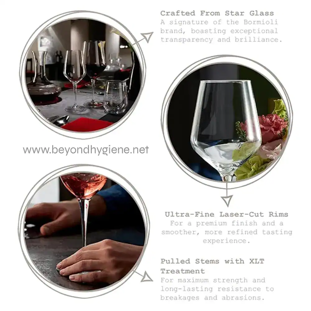 Transform your wine service with the Bormioli Rocco Electra 15 oz. Wine Glasses Set. This elegant set includes six wine glasses, each crafted from exclusive Star Glass. Known for its ultra-clear and lead-free composition, this glass ensures a stunning presentation of your favorite wines.
