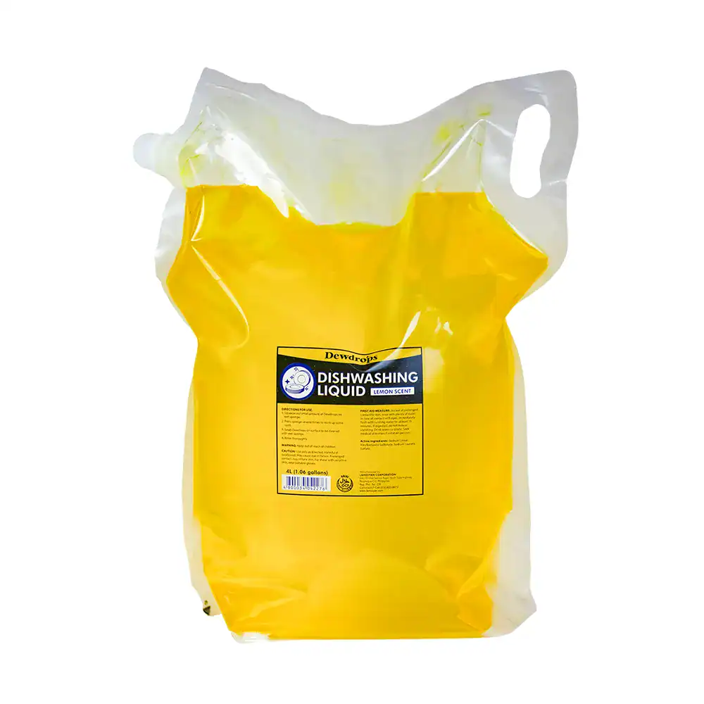 Product Description: Dewdrops Dishwashing Liquid in Lemon Scent is designed for effective and efficient dishwashing. This 4L (1.06 gallons) family-sized bottle is tough on germs, removes food odors, and is gentle on your hands. With a pleasant lemon scent, it ensures your dishes are clean and fresh.