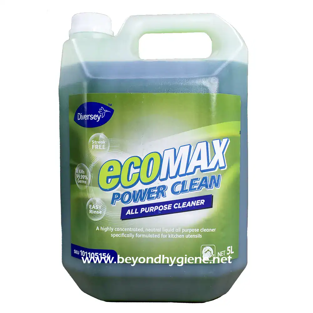 Diversey EcoMax PowerClean is a highly concentrated, neutral liquid cleaner designed specifically for kitchen utensils. This powerful formula ensures efficient cleaning with minimal product use, making it ideal for commercial and institutional settings.