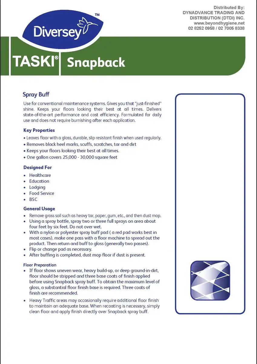 Snapback Spray Buff is designed for conventional floor maintenance systems, offering a “just-finished” shine and keeping floors looking their best at all times. Formulated for daily use, this product does not require burnishing after each application and provides state-of-the-art performance and cost efficiency.