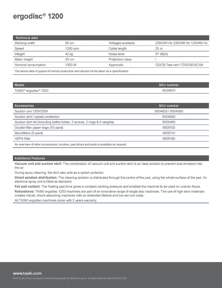 The Diversey Taski ergodisc® 1200 Ultra High-Speed Burnisher is an excellent choice for organizations looking to maintain glossy, spotless floors in high-visibility areas. Its powerful performance, user-friendly design, and durability make it an essential tool for any commercial cleaning operation that values both efficiency and quality.