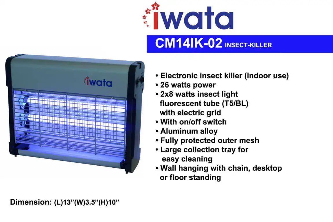 The IWATA CM14IK-02 Electronic Insect Killer is designed to deliver powerful indoor pest control with a blend of efficiency and durability. Operating at 26 watts, this insect killer uses two 8-watt T5/BL fluorescent tubes to attract and eliminate insects. The unit is equipped with an electric grid and features an aluminum alloy construction, ensuring longevity and performance. A fully protected outer mesh and a large collection tray make maintenance straightforward, while the on/off switch provides convenient operation. This versatile device can be wall-hung with a chain or used as a desktop or floor-standing unit, making it suitable for various indoor settings.