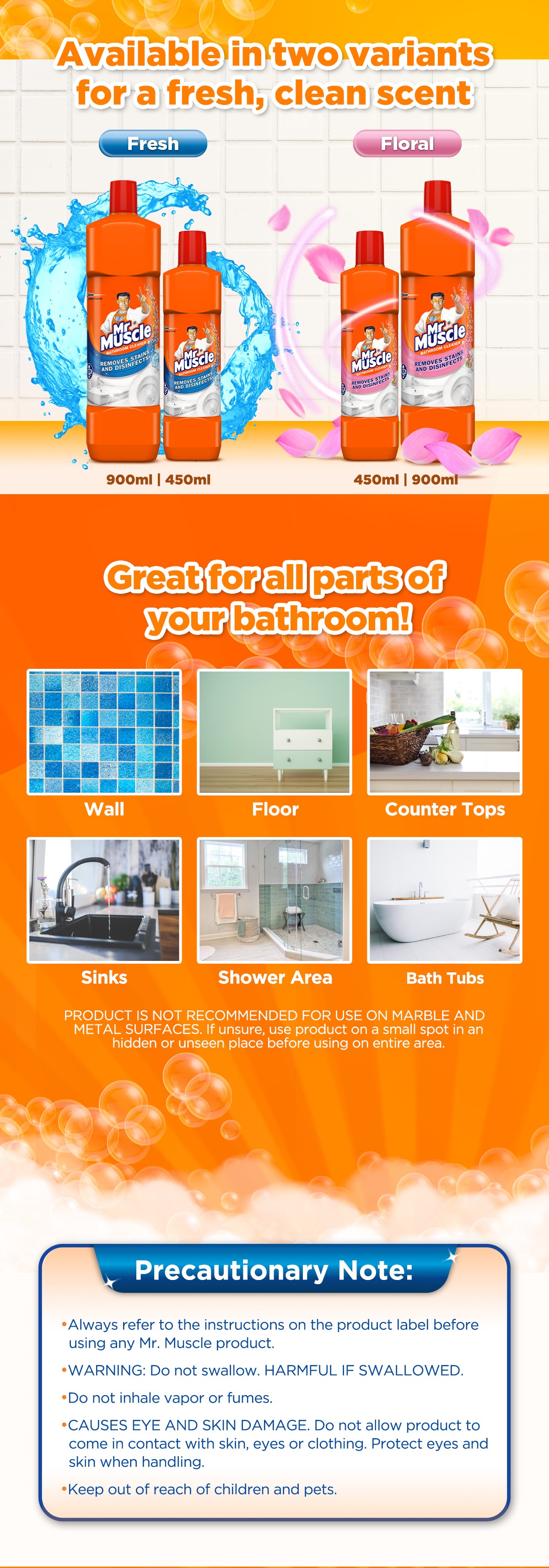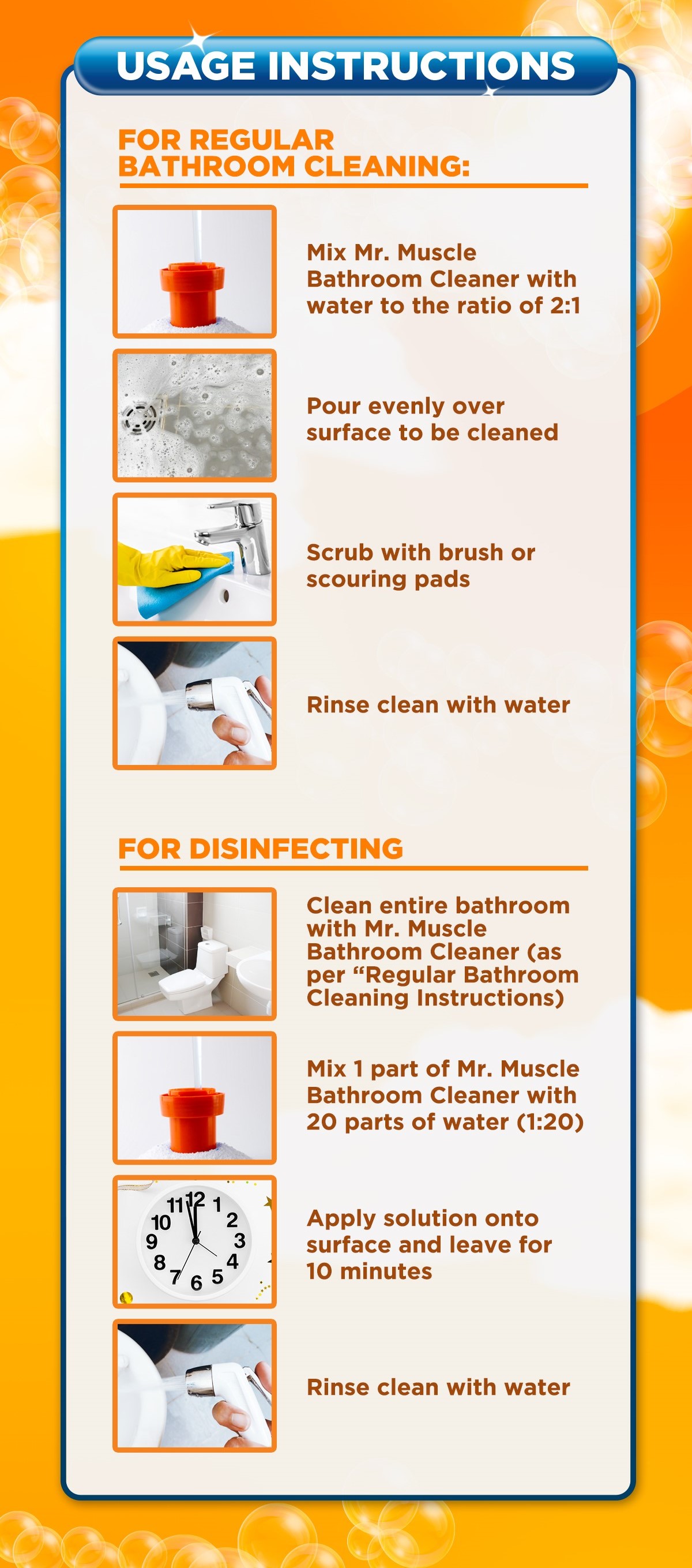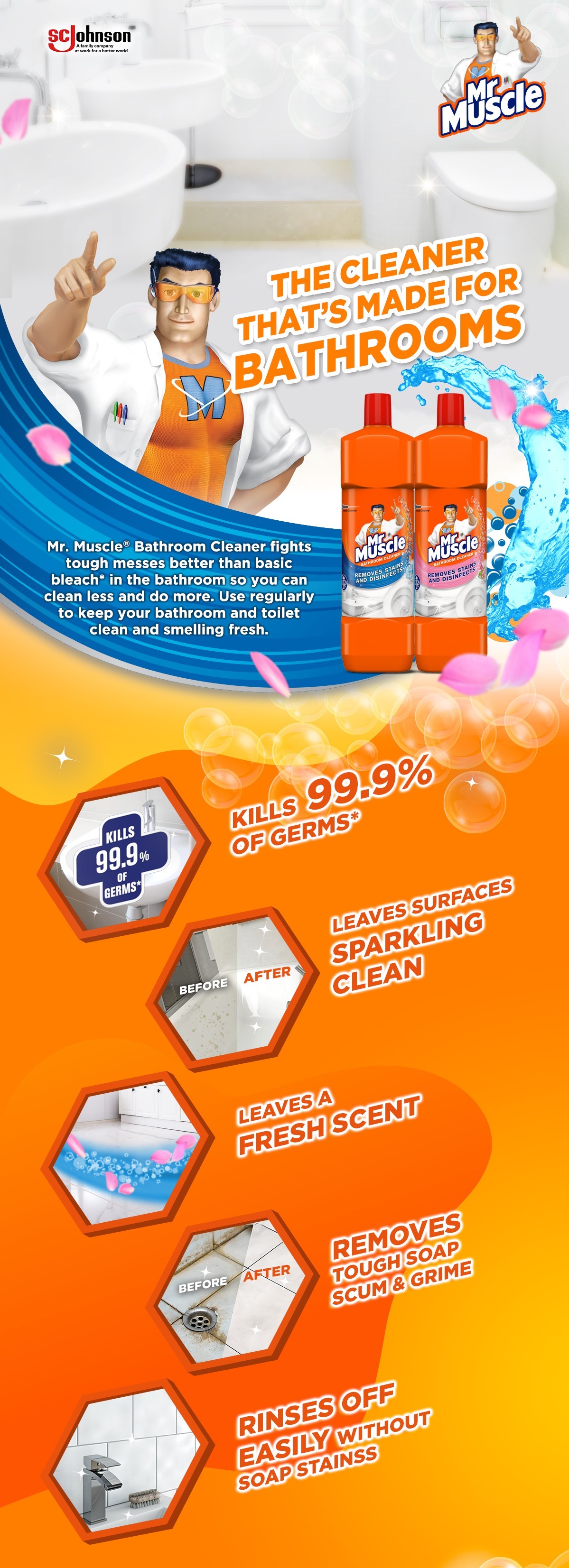 Mr. Muscle® Bathroom Cleaner removes stains and disinfects. It is ideal for frequent cleaning, fighting tough messes better than basic bleach in the bathroom so you can clean less and do more.