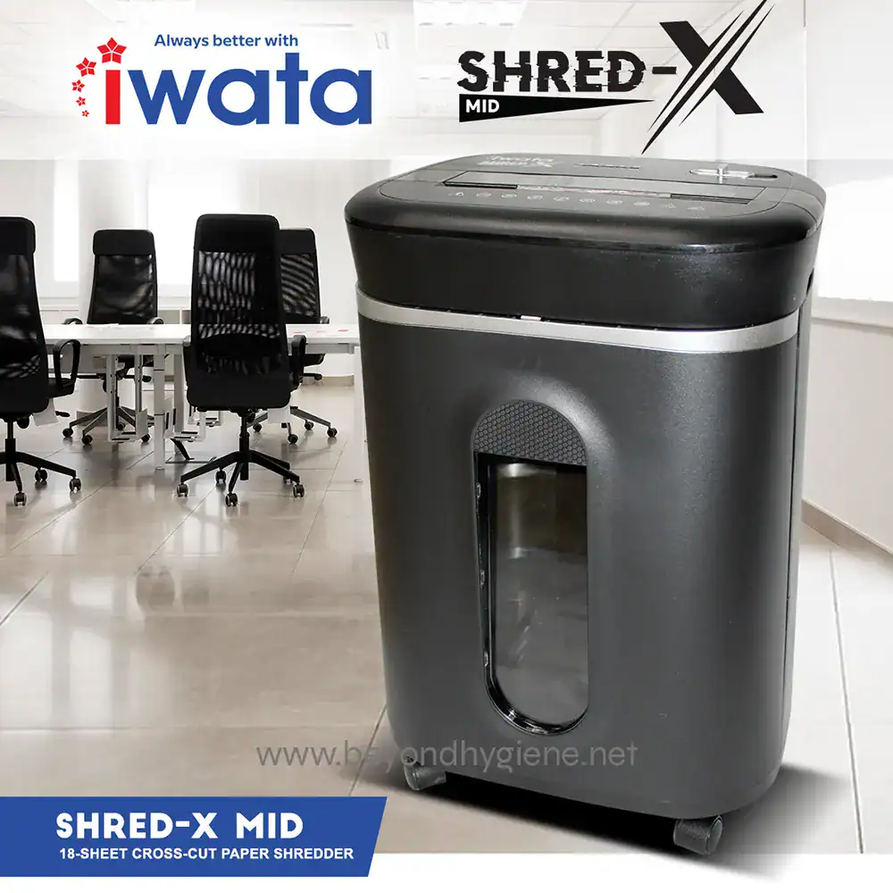 The Iwata Paper Shredder Shred-X Mid is a powerful and versatile shredder designed to handle substantial shredding tasks. Capable of shredding up to 18 sheets of 20lb bond paper at once, it ensures thorough and secure document destruction. It also features dedicated slots for shredding credit cards or CDs/DVDs one at a time. The shredder operates with 396 watts of power and offers a 30-minute run time with a 45-minute cooldown period. The 22.7-liter pull-out bin simplifies disposal, while the caster wheels facilitate easy movement. The shredder includes LED indicators for standby, overload, overheat, door open, and bin full, along with auto start/stop and anti-jam reverse functions for added convenience.