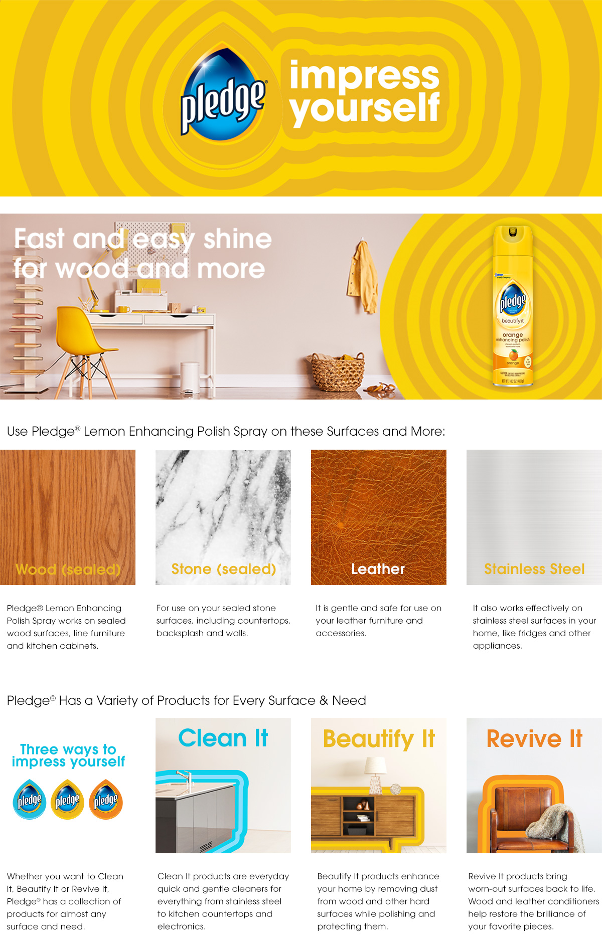 Pledge Furniture is a wood and furniture care enhancing polish. It protects the wood while leaving a beautiful shine and refreshing scent that will illuminate your home and welcome people in. Multi-surface convenience.