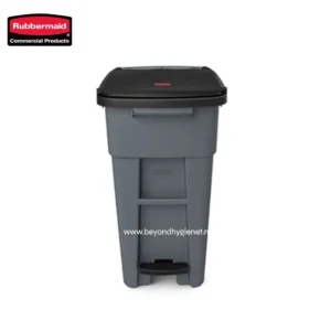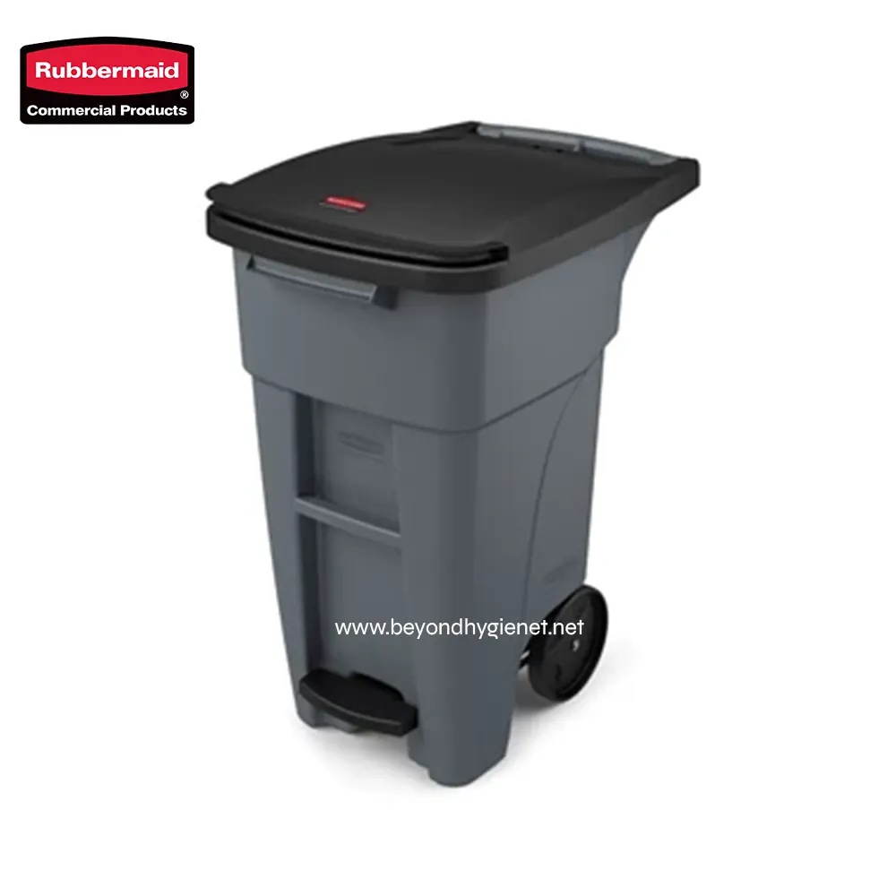 The Rubbermaid Commercial Products Step-On Rollout Container is designed to make managing facility waste easier. With one step, the pedal lifts the lid and allows for hands-free waste disposal.