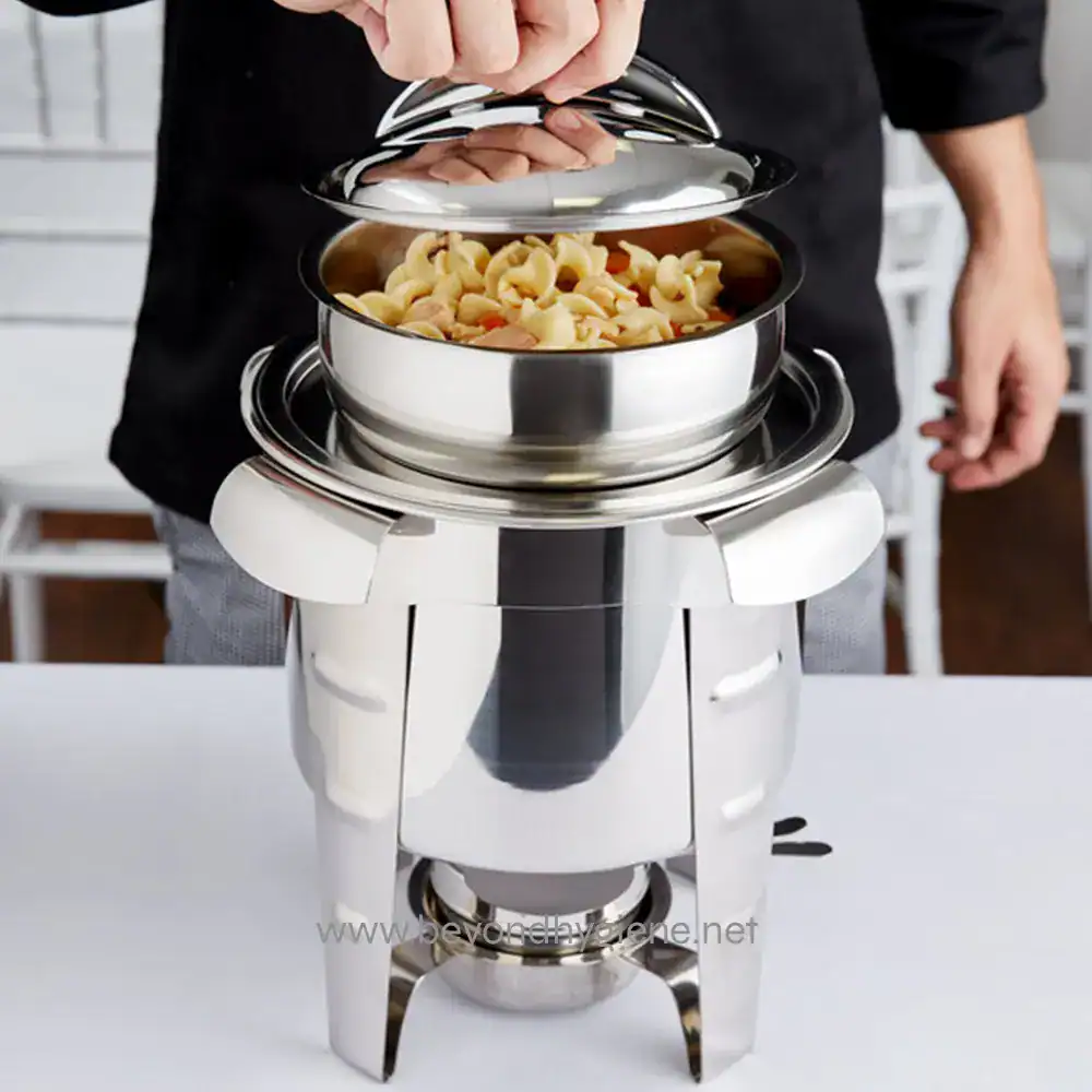 The marmite features a notched cover that conveniently holds serving utensils, and a central fuel holder provides even heat distribution to keep your food warm. Ergonomic side handles make transportation and setup easy, while the accented top handle allows for effortless serving and refilling.